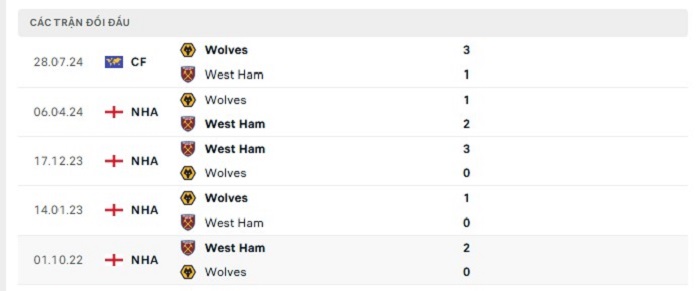 Lịch sử đối đầu của West Ham vs Wolves