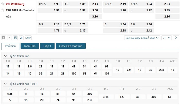 Bảng tỷ lệ kèo bóng đá trận đấu Wolfsburg vs Hoffenheim