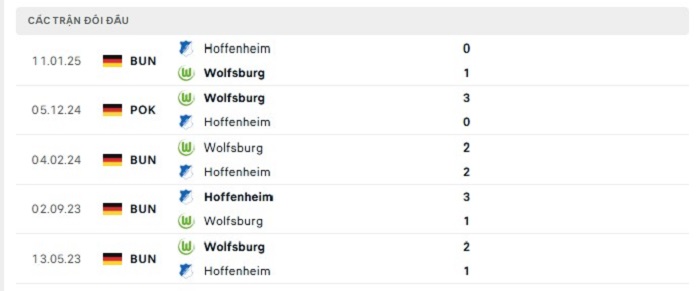 Lịch sử đối đầu của Wolfsburg vs Hoffenheim
