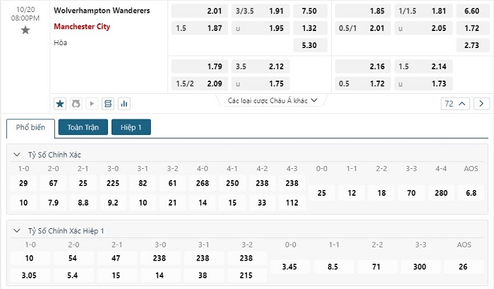 Thống kê tại những trận gặp nhau giữa Wolverhampton và Manchester City gần đây có tỷ lệ ghi bàn cũng không quá cao, có thể nhận thấy trong 4 trận gần nhất chỉ duy nhất 1 trận chạm vào mốc 4 bàn thắng được ghi. Manchester City đang sở hữu được hàng thủ trên sân khách tốt nhưng hàng công của họ lại không thực sự hiệu quả ở những trận xa nhà, còn với Wolverhampton thì khả năng ghi bàn kém của họ ở mùa giải cũng có thể thấy được khả năng tỷ số cao xuất hiện trong trận đấu không được đánh giá cao.