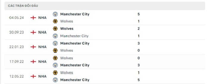 Lịch sử đối đầu của Wolverhampton vs Manchester City